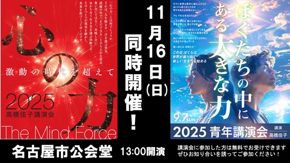 11月16日(日)13時から名古屋市公会堂にて「2025高橋佳子講演会映像の集い」と「2025青年講演会映像の集い」が開催されます!