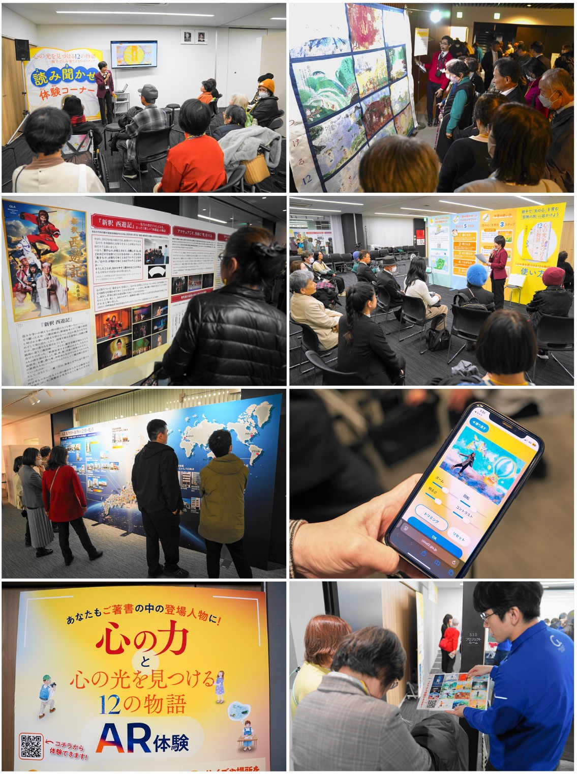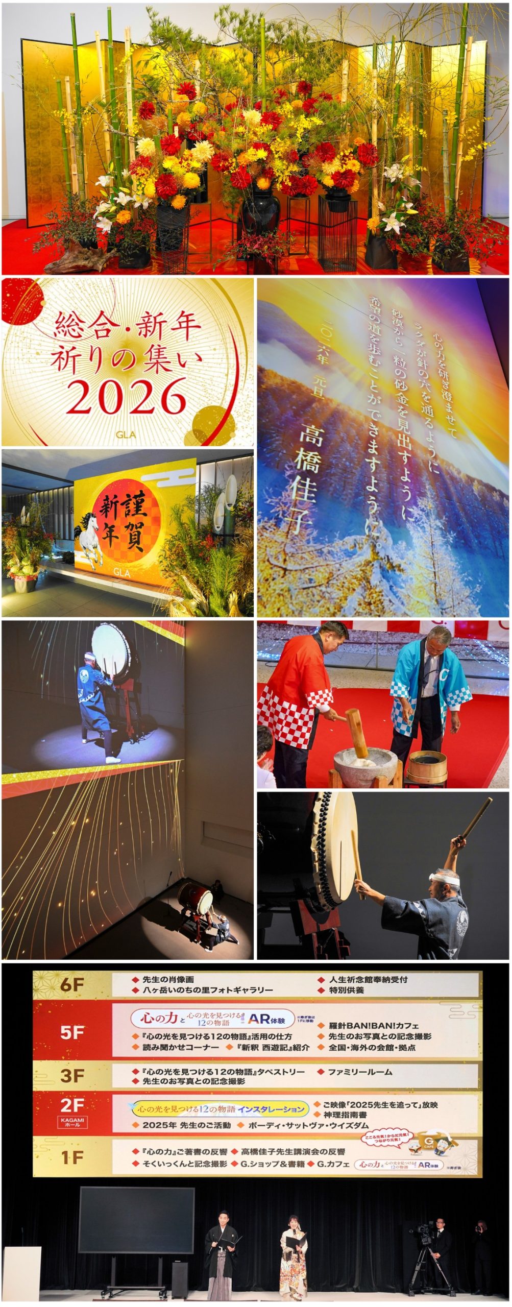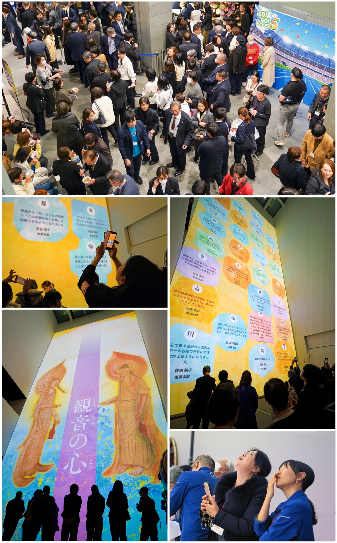 正月飾りで彩られた中京会館のエントランスでは、金屏風を背にした生け花が来場者の方々を出迎えます。館内は、「G.EXPO2026」と題し、「魂の学」の人間観・世界観が体験できる様々なコーナーが設置され、神理のテーマパークさながらです。とりわけ、2025年に発刊された高橋先生の著書『心の力』と『心の光を見つける12の物語』の世界を体感できるAR体験コーナーには多くの人々が訪れ、終始賑わっていました。また、高さ25メートルの吹き抜けの壁面を活用したインスタレーションは圧巻で、スマートフォンから投稿した言葉が映し出されると歓声とともに、天へと昇ってゆくご自身の言葉をじっと見つめていました。