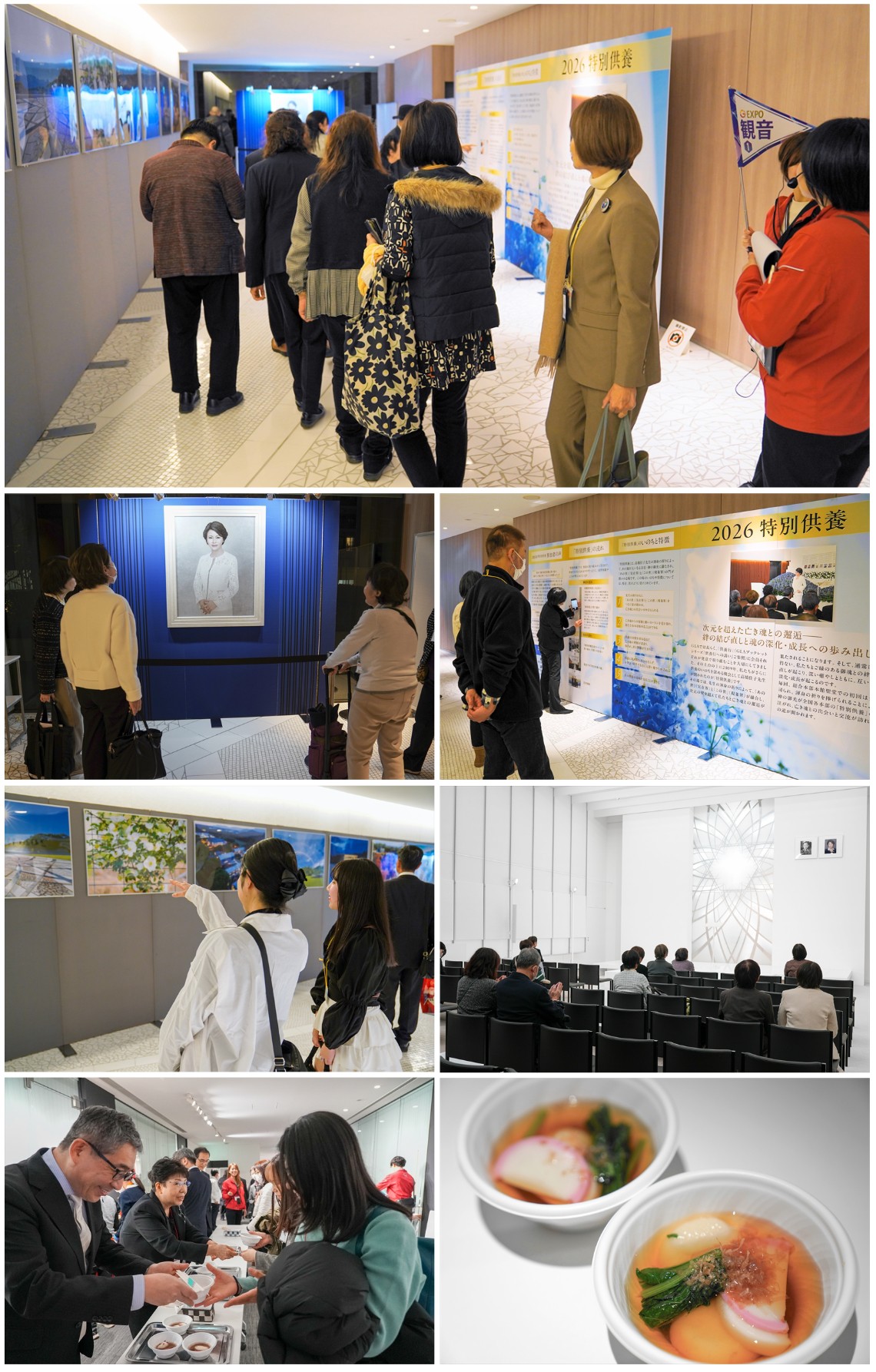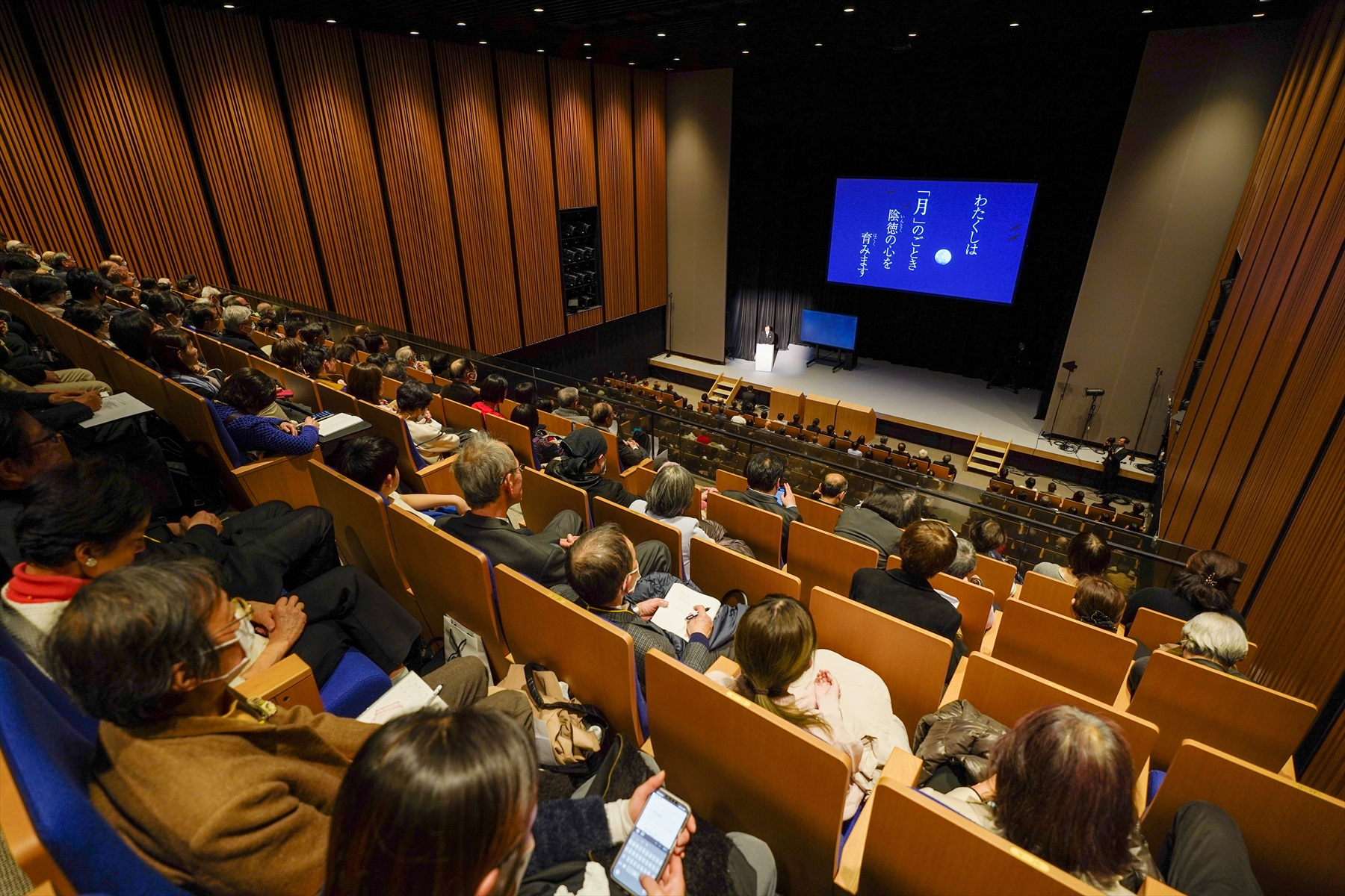 年が明ける直前、先生は聖堂で「2026年開闢(かいびゃく)の祈り」を捧げられた後、KAGAMI HALLに移動し、講話の時となりました。先生は、限りある時間の中で人生をどう生きるかについて考えることから話を始められました。そして、人生には「陰」(苦しいこと、悲しいこと、損をすること)と「陽」(うれしいこと、楽しいこと、得をすること)があり、避けたいように思える「陰」の出来事であっても、困難を迎えるからこそ生まれる成長や飛躍があると説かれ、さらに「困難は、人生を豊かにする入口である」と語られたのです。講話の最後、「12の菩提心」の切願唱和が行われ、新しい年に向けて、皆で心を定めるひとときとなりました。